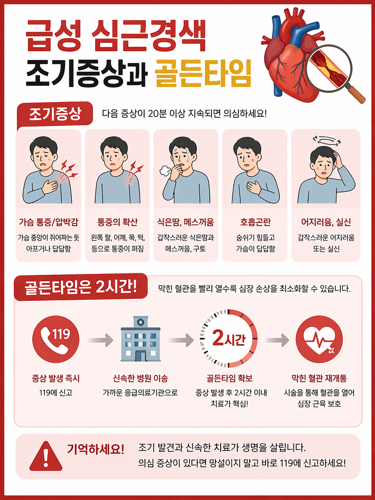 심근경색은 갑자기 찾아오는 것처럼 보이지만, 사실 몸은 미리 신호를 보내고 있습니다. 제가 직접 겪어보니 그 신호가 너무 일상적이어서 오히려 무시하게 된다는 게 문제였습니다.
